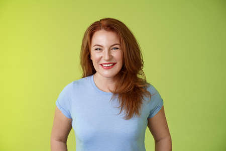 Cheerful kind happy redhead middle-aged mother look caring delighted smiling broadly gaze admiration joy stand blue t-shirt green background amused enthusiastic expression