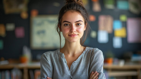 Portrait of a young female teacher standing in a classroom.