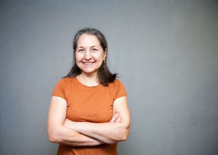 Photo of gorgeous mature woman standing isolated above gray background