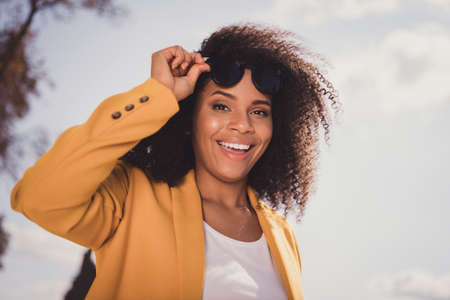 Portrait of attractive cheerful wavy-haired girl spending free spare time pastime on fresh air touching specs having fun outdoors