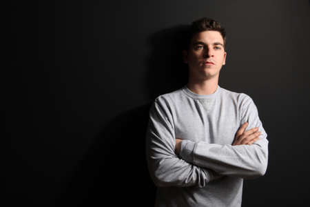 Portrait of young man with crossed arms against black background. Space for text