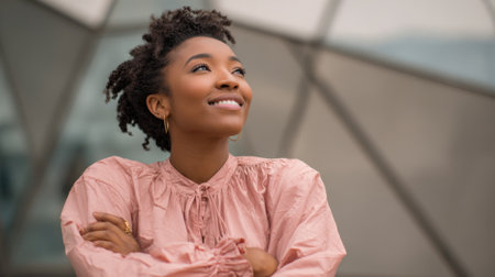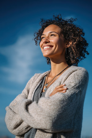 Outdoor portrait of a strong woman smiling confidently against a clear blue sky. Captured in natural light, her expression exudes pride and cinematic confidence.