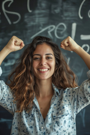 Woman With Raised Arms in Front of Blackboard