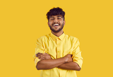 Portrait of funny young indian man isolated on yellow studio background look at camera laughing smiling. Happy biracial guy feel optimistic and joyful. Diversity and multicultural society.