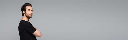 bearded and good-looking man in black t-shirt standing with crossed arms isolated on gray, banner