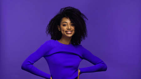 cheerful african american young woman with braces looking at camera isolated on purple