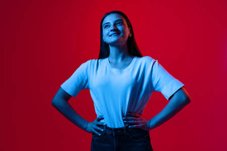 Cropped portrait of young beautiful woman in white T-shirt smiling and looking up isolated over red background in neon lights