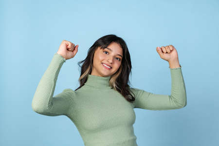 Studio shot of young smiling beuatiful girl, student in casual style clothes raises hands isolated on blue studio backgroud.