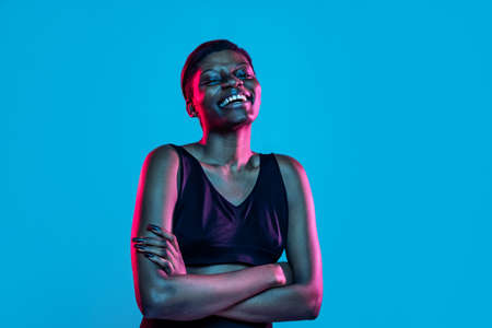 Portrait of young beautiful dark skinned woman posing isolated on blue studio background in neon light.