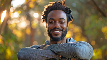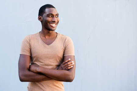 Front portrait young smiling African American man with arms crossed against gray background and looking away