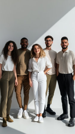 Group of five diverse young adults standing in casual clothing with bright light. Represents unity, diversity, and modern friendship.