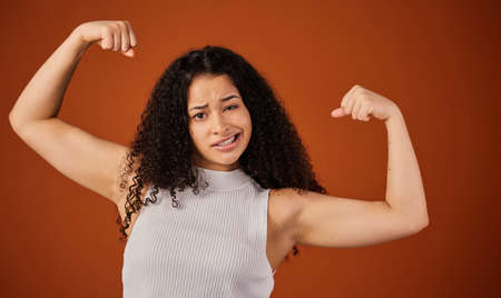 Im crazy strong. Cropped portrait of an attractive young woman flexing her biceps in studio against a red background.