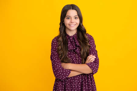 Portrait of young teenage girl standing with crossed arms against yellow background with copy space.
