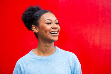 A young woman wearing a light blue sweater and natural hairstyle, smiling while looking off-camera in front of a bright red backdrop