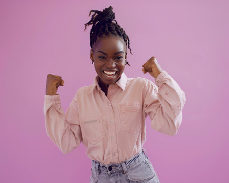 Young excited happy black woman, wearing casual clothes, doing winner gesture celebrate on plain purple background. AI generative