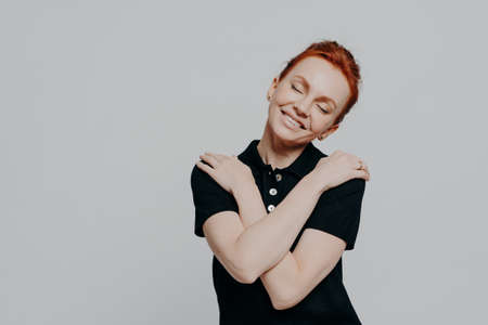 Happy red-haired woman with closed eyes dressed casually hugging herself gently and tilting head, pretty ginger female being in romantic mood while standing isolated over grey studio background
