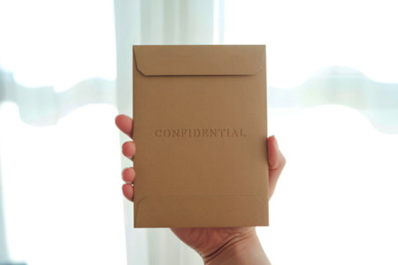 A person's hand holds up a light brown envelope with the word Confidential embossed on the front. The background is blurry, showing a bright window.