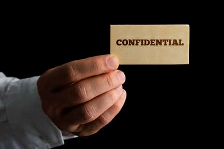 Close up view of the hand of a man holding a business card reading - Confidential - in a conceptual image over a black background with copyspace.