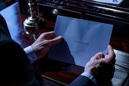 A close-up shot captures the tense moment of two people secretly exchanging a white envelope marked with a bold red 'CONFIDENTIAL' rubber stamp, implying a private deal.