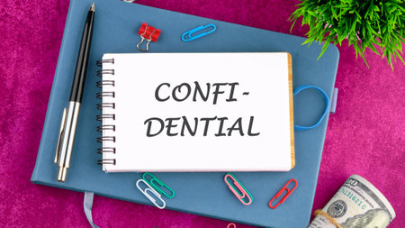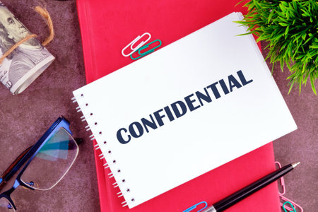 CONFIDENTIAL word alphabet letters in a notebook in front of an abstract background.
