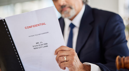 Lawyer, confidential and paperwork with hands holding patient file and documents in office. Compliance, legal report and attorney employee in a law firm with government contract and policy reading