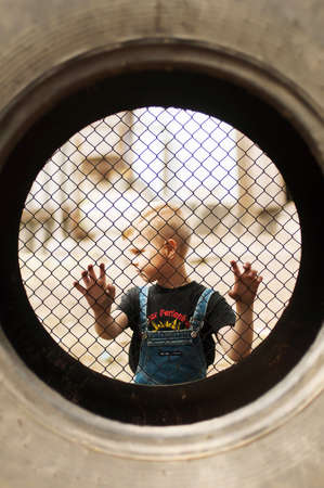 Child refugee hand holding a metal fence. Social problem of war migrants.