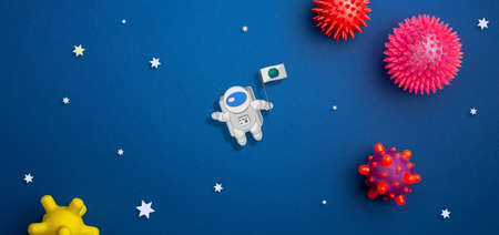 International day of human space flight. 12 April World Cosmonautics Day. Astronaut explores space on a blue isolated background. The concept of distant galaxies and deep space.