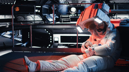 Astronaut sits alone on space station, showing signs of distress after long isolation. Cosmonaut in psychological crisis in spaceship, feeling lonely after long space trip