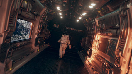 Astronaut in Space Station, Draw a life-like portrait of an astronaut wearing a suit, floating weightlessly inside a space capsule, AI Generated