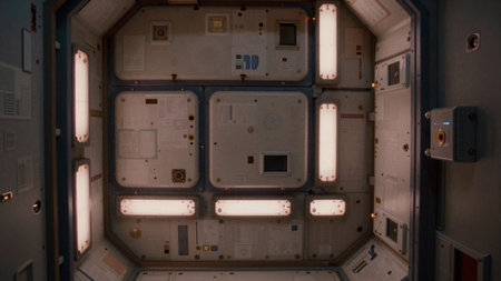 Bright lights illuminate the sleek walls of a space station module, showcasing a blend of technology and engineering.