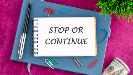 STOP OR CONTINUE written in a notebook in front of an abstract background.