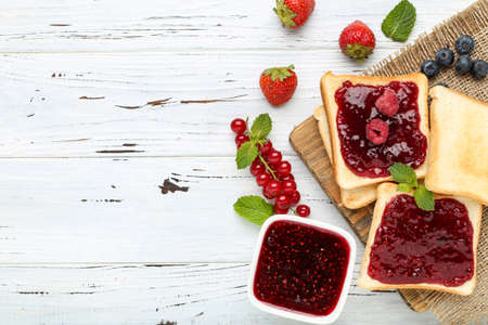 Toasts with raspberry jam with fresh berries on white wooden table