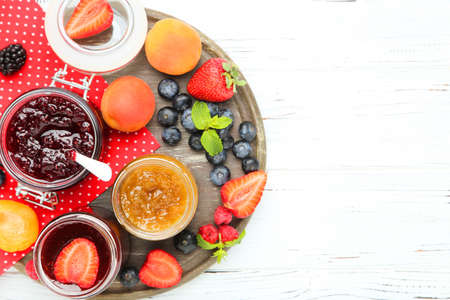 Sweet jam in glass jars with ripe berries on white wooden table