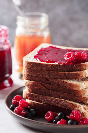 Toast with jam. Raspberry and apricot jam with berries. Fruit jam for Breakfast. Fresh and healthy breakfast with toast