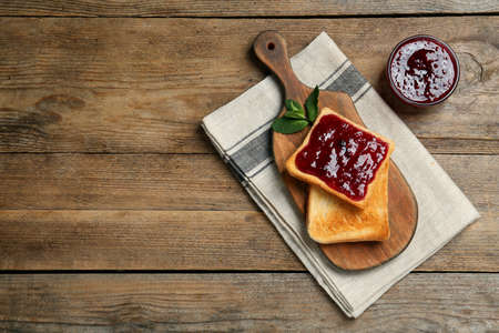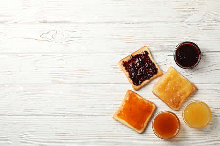Toasts with delicious jams on wooden background, top view