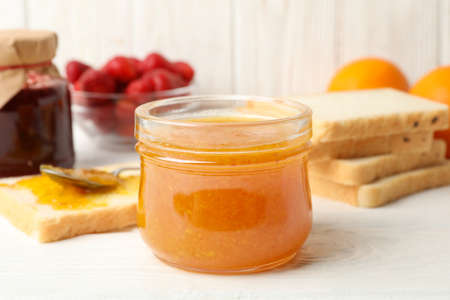 Composition with apricot jam on white wooden background. Sweet breakfast