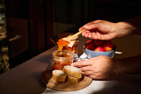 Close-up of the hands of a housewife holding a wooden spoon and spreading homemade apricot jam on bread.