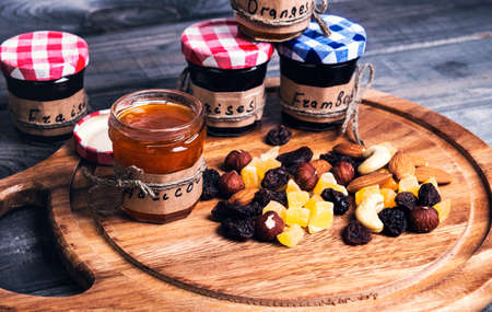 Small glass jars with lids with fruit or berry jam tied Shapagat on the table, round cutting board, candied fruit, nuts - hazelnut, cashew, almond