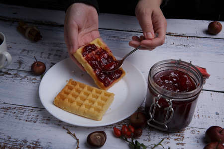 child hands spread strawberry jam with a spoon on Belgian waffles