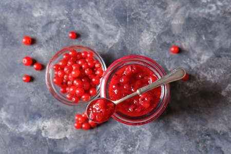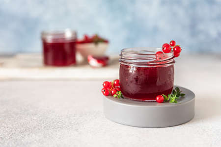 Homemade red currant jam or jelly in glass jars and red currants fresh berries on wooden cutting board.