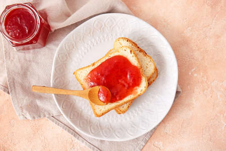 Plate with tasty strawberry jam and bread on color background