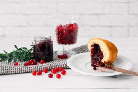 Tasty croissant with lingonberry jam on table