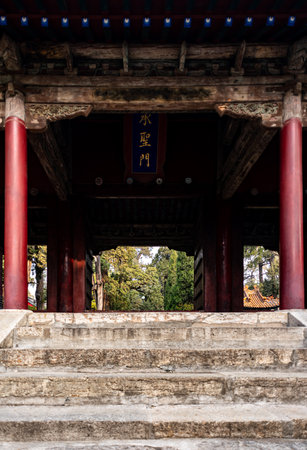 Red Entrance Gate Confucius Temple Qufu Shandong Province, China Chinese characters say Ru Sheng Gate