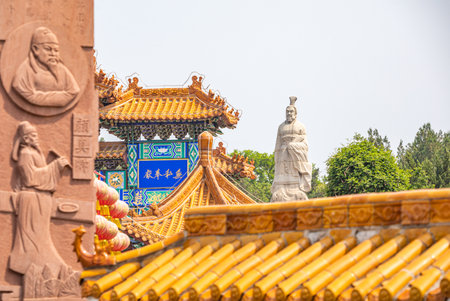 confucius statue with chinese historic traditional architecture background