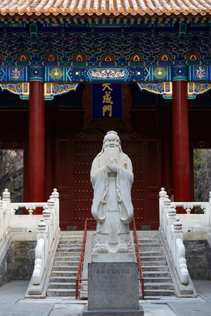Confucius statue in front of Dacheng Gate at Beijing Confucius Temple.