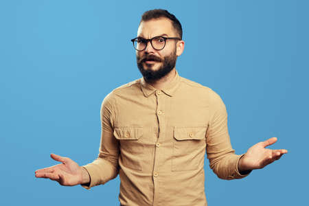 Young bearded man in bewilderment shrugging his shoulders and looking at camera with confusion, isolated over blue background