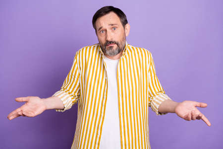 Photo of charming upset age gentleman wear yellow shirt shrugging shoulders isolated purple color background