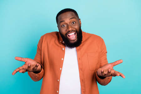 Photo of young afro man happy positive smile ask questioned puzzled isolated over teal color background