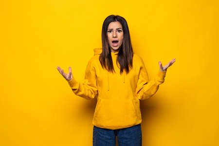 Disgruntled confused annoyed young millennial woman raising hands, indignantly asking reason of failure, wears denim jacket, isolated on blue studio background. Emotion and misunderstanding concept.