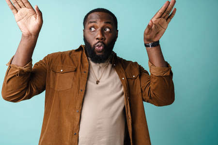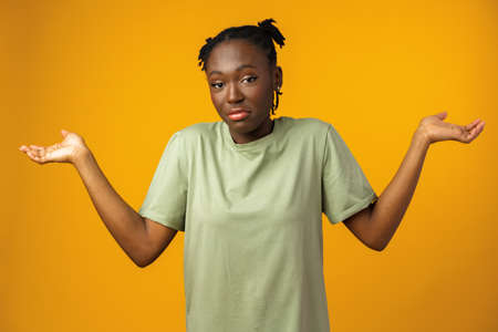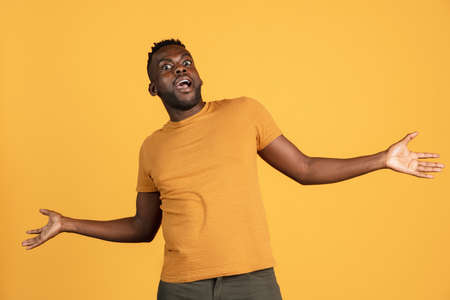 Portrait of confused handsome casual young african american man with raised arms and looking at camera dont know answer on question showing shrug shoulders gesture. Indoor studio shot